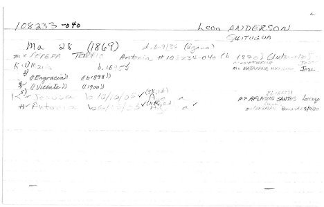 The image below is a copy of a genealogy index card originally produced by Dr. Jane Underwood and housed at the Micronesia Area Research Center, University of Guam. It contains some key information, but the accuracy of the data and the sources of information recorded by Underwood are currently unknown.